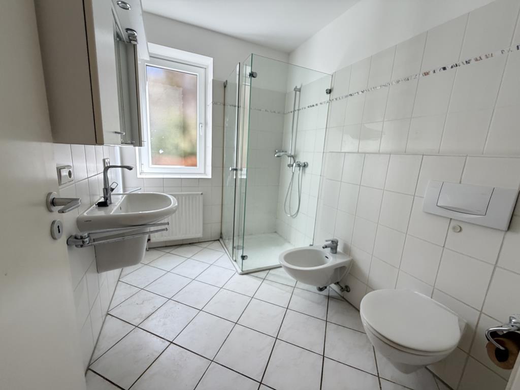 Das helle Bad verfügt über ein Fenster und ist mit einer Dusche ausgestattet.