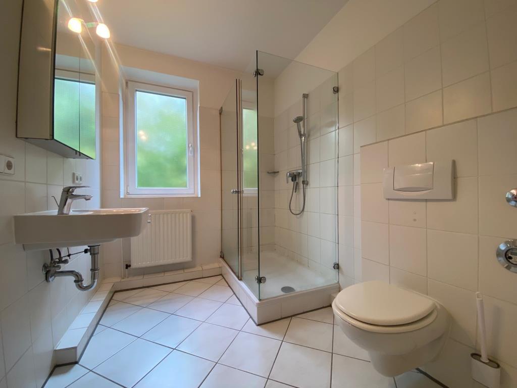 Das helle Bad verfügt über ein Fenster und ist mit einer Dusche ausgestattet.