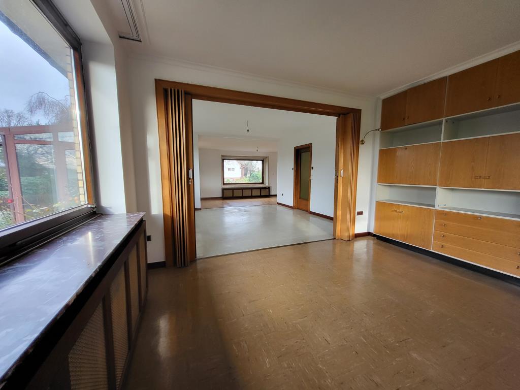 Von dort gelangen Sie in das angrenzende Esszimmer, welches in das weitere großzügige Wohnzimmer 1 und 2 übergeht. Vom Esszimmer aus erreicht man auch die große rückwärtige Terrasse mit einem Laubdach. Von dort hat man einen wunderschönen Blick auf die anliegenden Felder. Vom Wohnzimmer kann man in den ca. 15 m² großen Wintergarten gehen, der durch eine Fußbodenheizung und einen Heizkörper beheizt werden kann.