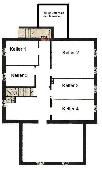 Vom Erdgeschoss Flur führt eine Treppe in den Keller. Hier befinden sich 4 Räume, die unterschiedliche Zuordnungen haben könnten: Heizungs-, Wäsche-, Vorrats-, und Geräteraum. Ein Raum im Keller ist mit einem Heizkörper ausgestattet. Der Keller verfügt auch über eine Treppe direkt nach draußen in den Garten.