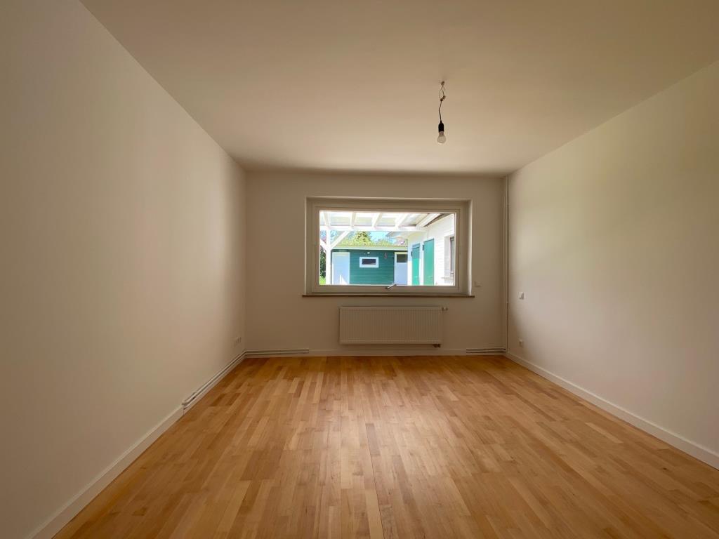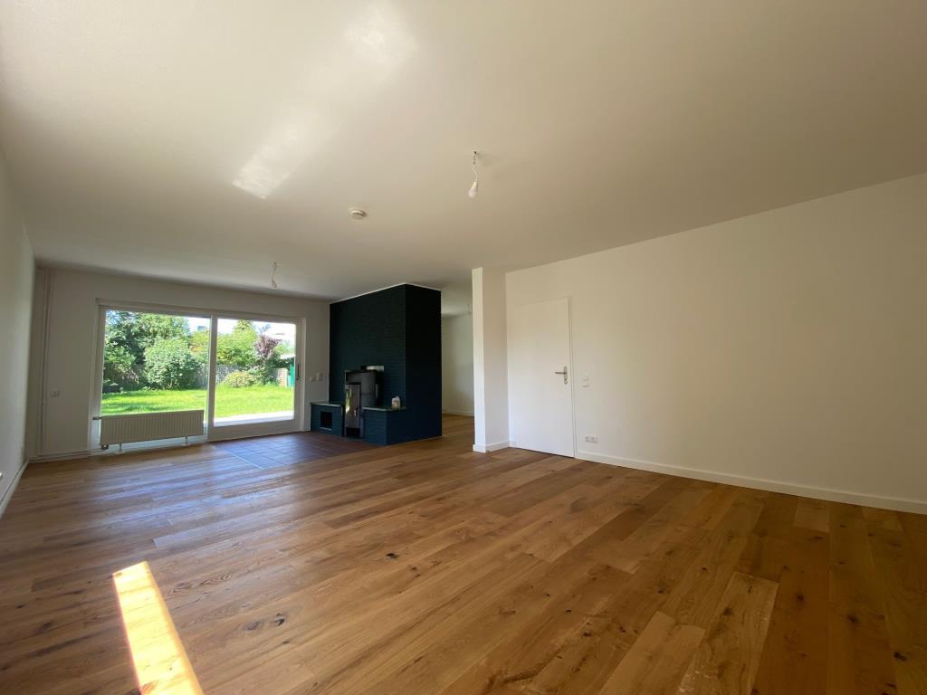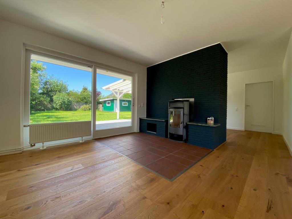 Über die Diele erreichen Sie auf dieser Ebene das großzügige Wohnzimmer mit einem Kamin. Der offene Esszimmerbereich schließt sich an und dient als Verbindungsraum zur Küche. Im Wohn- und Esszimmer wurde neuer Parkettfußboden verlegt. Durch das Wohnzimmer gelangen Sie auf die ca. 40 m² große und überdachte Terrasse.