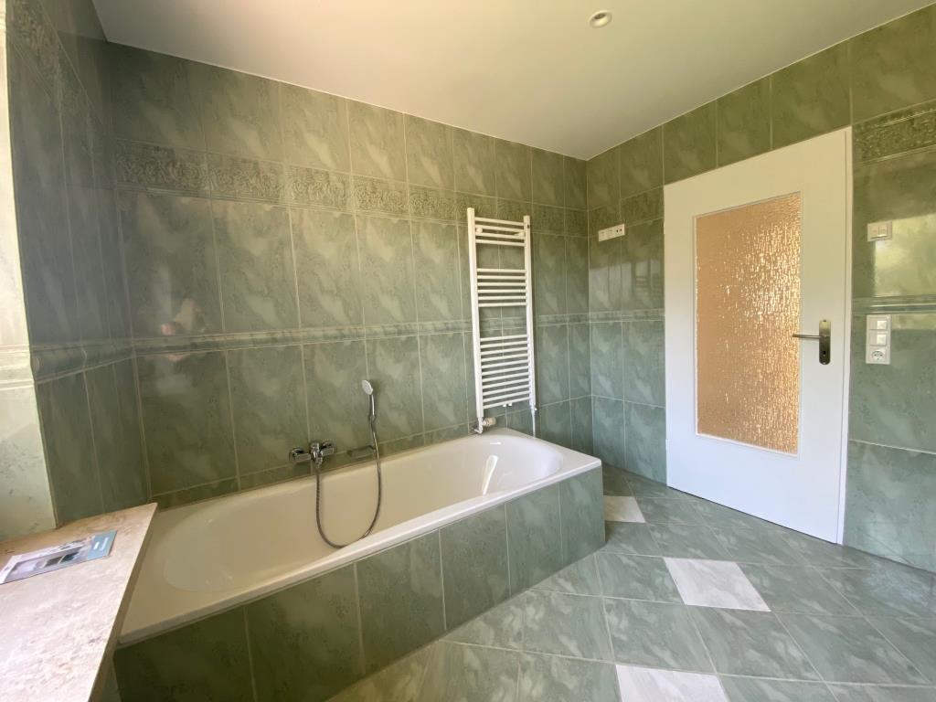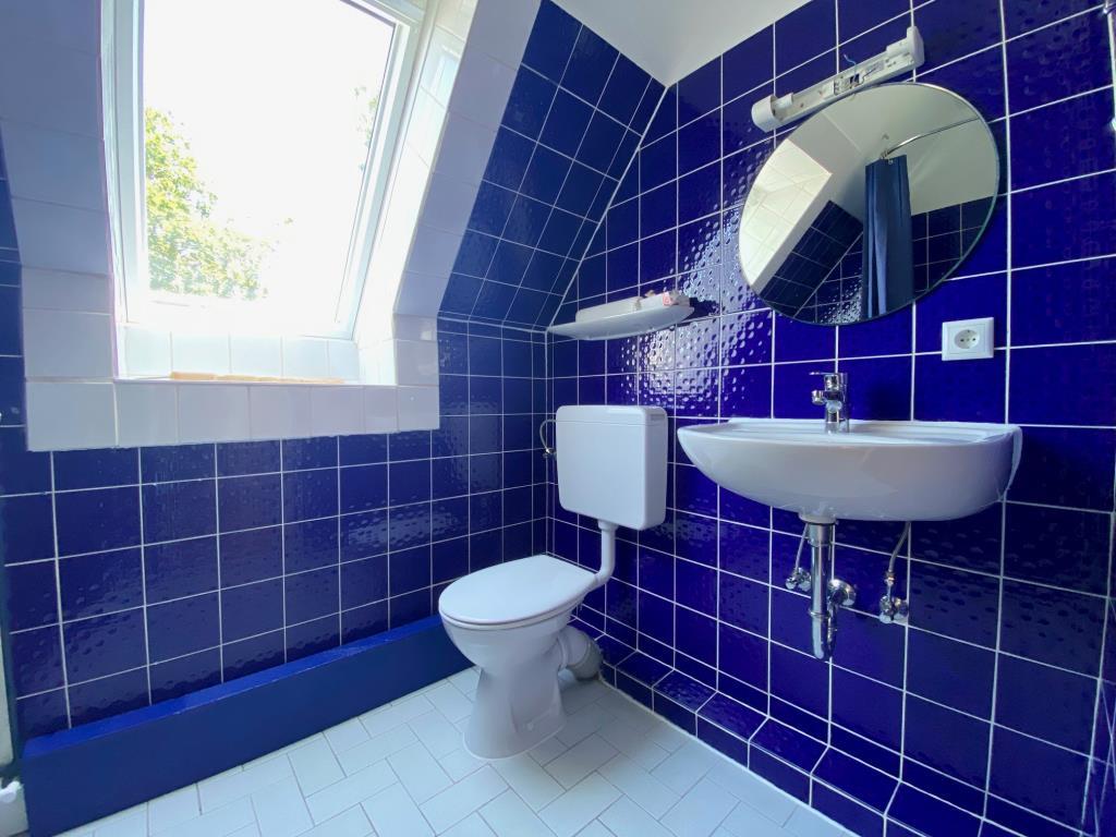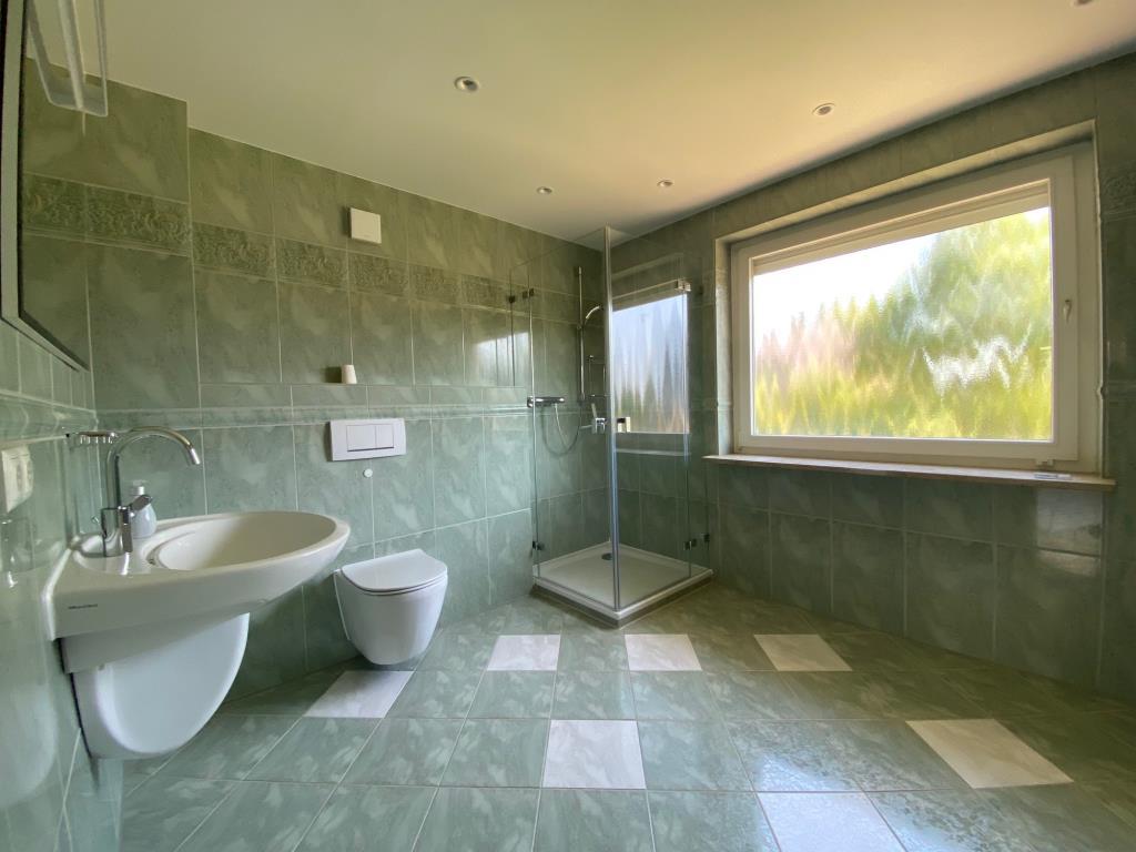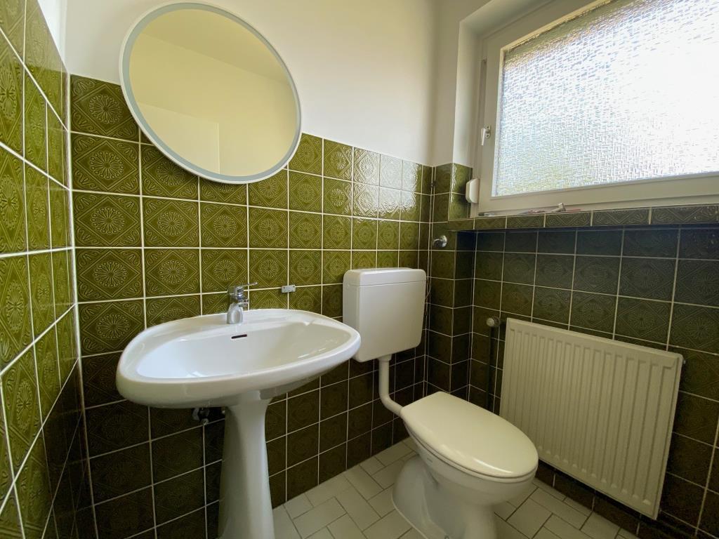 Weiterhin finden Sie auf dieser Ebene ein Schlafzimmer mit Blick in den herrlichen Garten, ein Gäste-WC sowie das Vollbad mit einer Wanne und einer Dusche. Ein Hauswirtschaftraum bietet ausreichend Abstellraum.