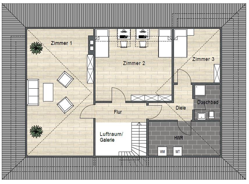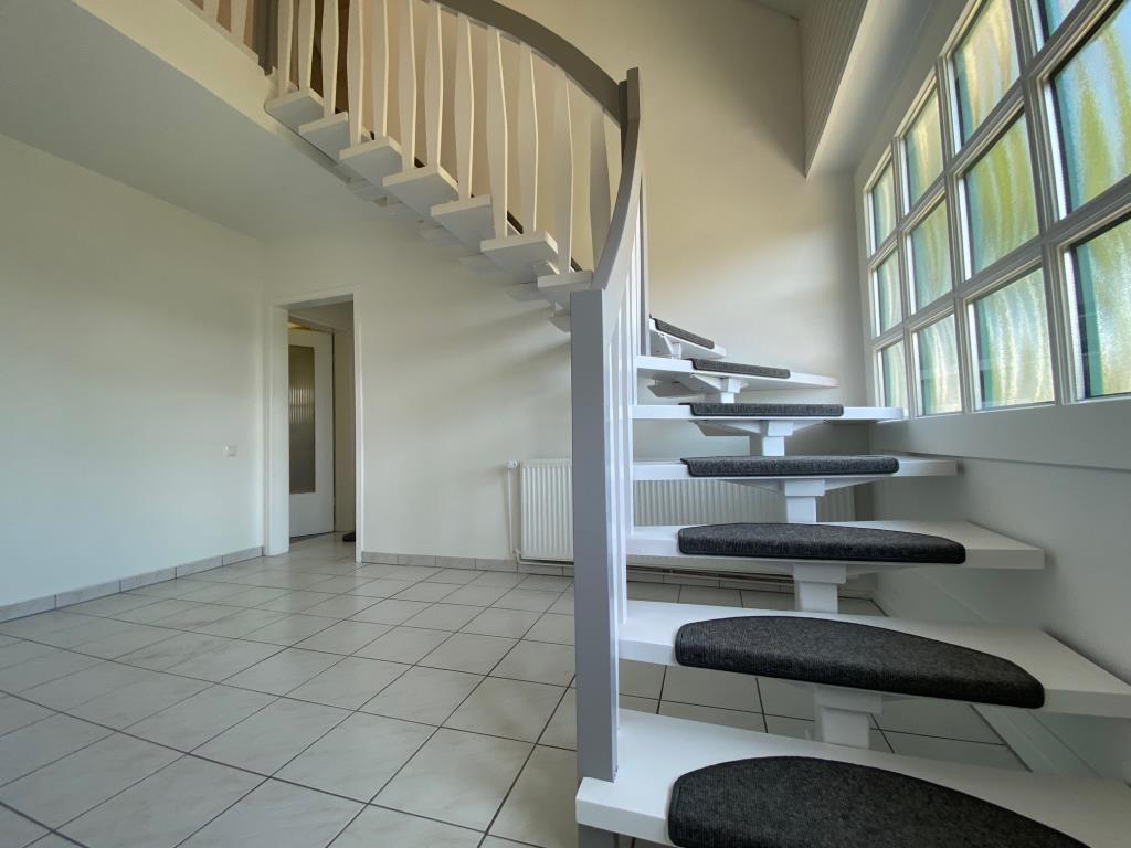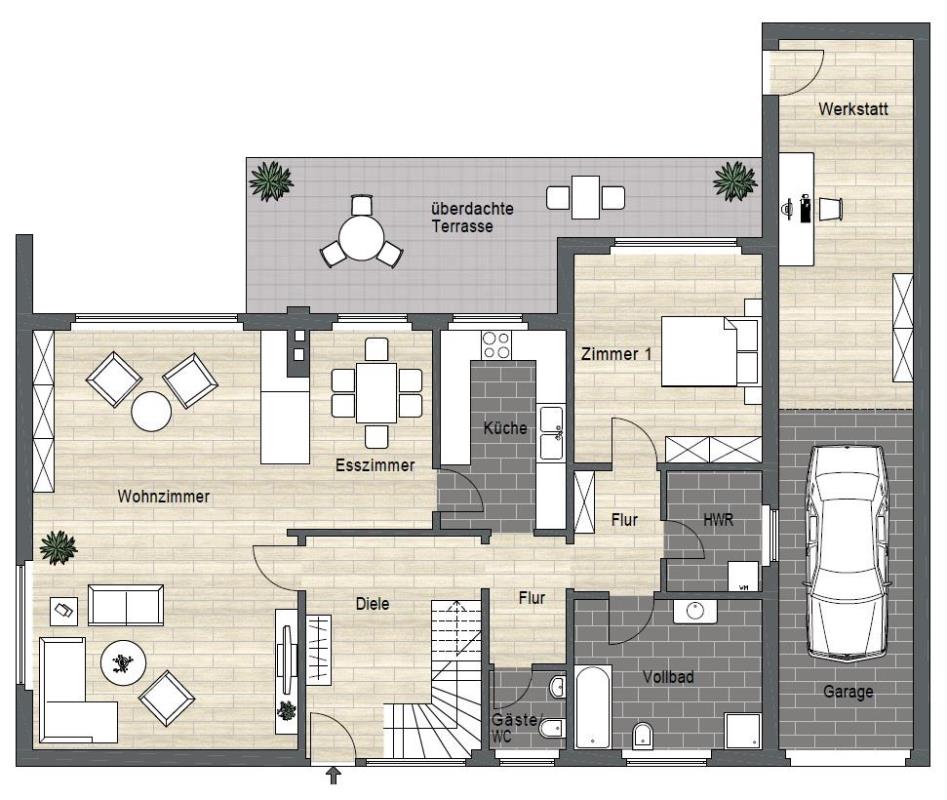 Sie betreten das Einfamilienhaus über eine geräumige Diele mit einer offenen Galerie in das Obergeschoss. Dorthin führt eine offene Treppe.
