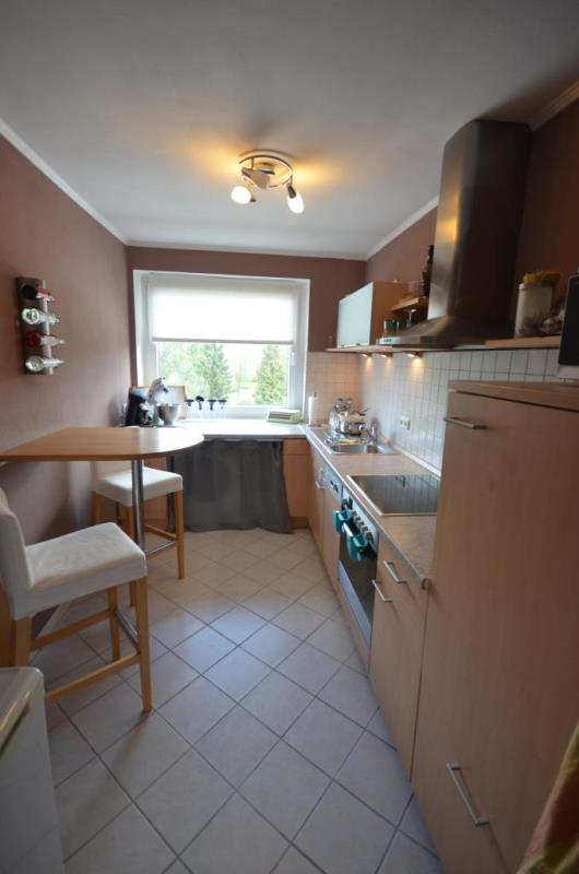 Die helle Einbauküche ist mit sämtlichen E-Geräten ausgestattet und hat zudem eine Frühstückstheke mit zwei Hochstühlen.